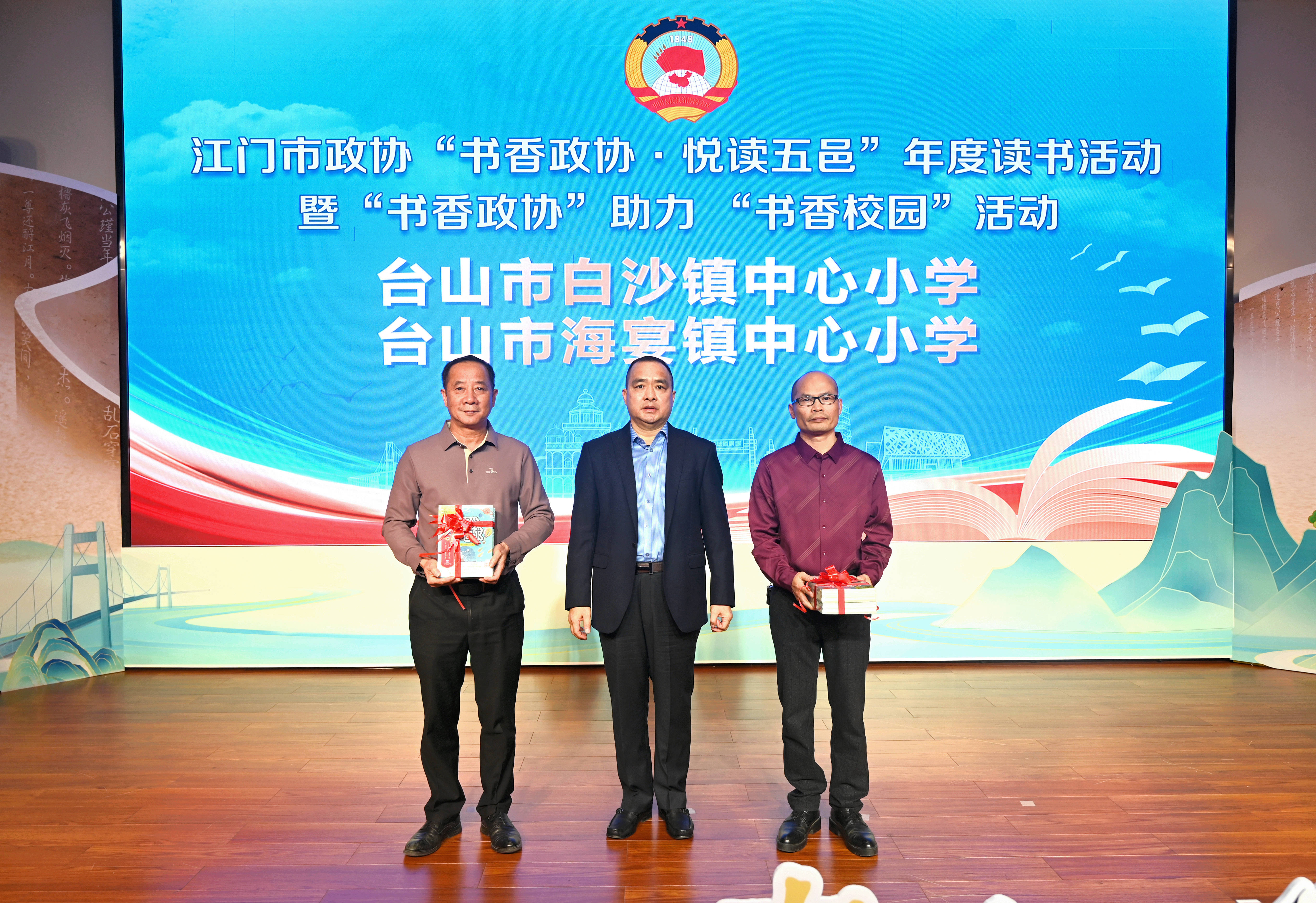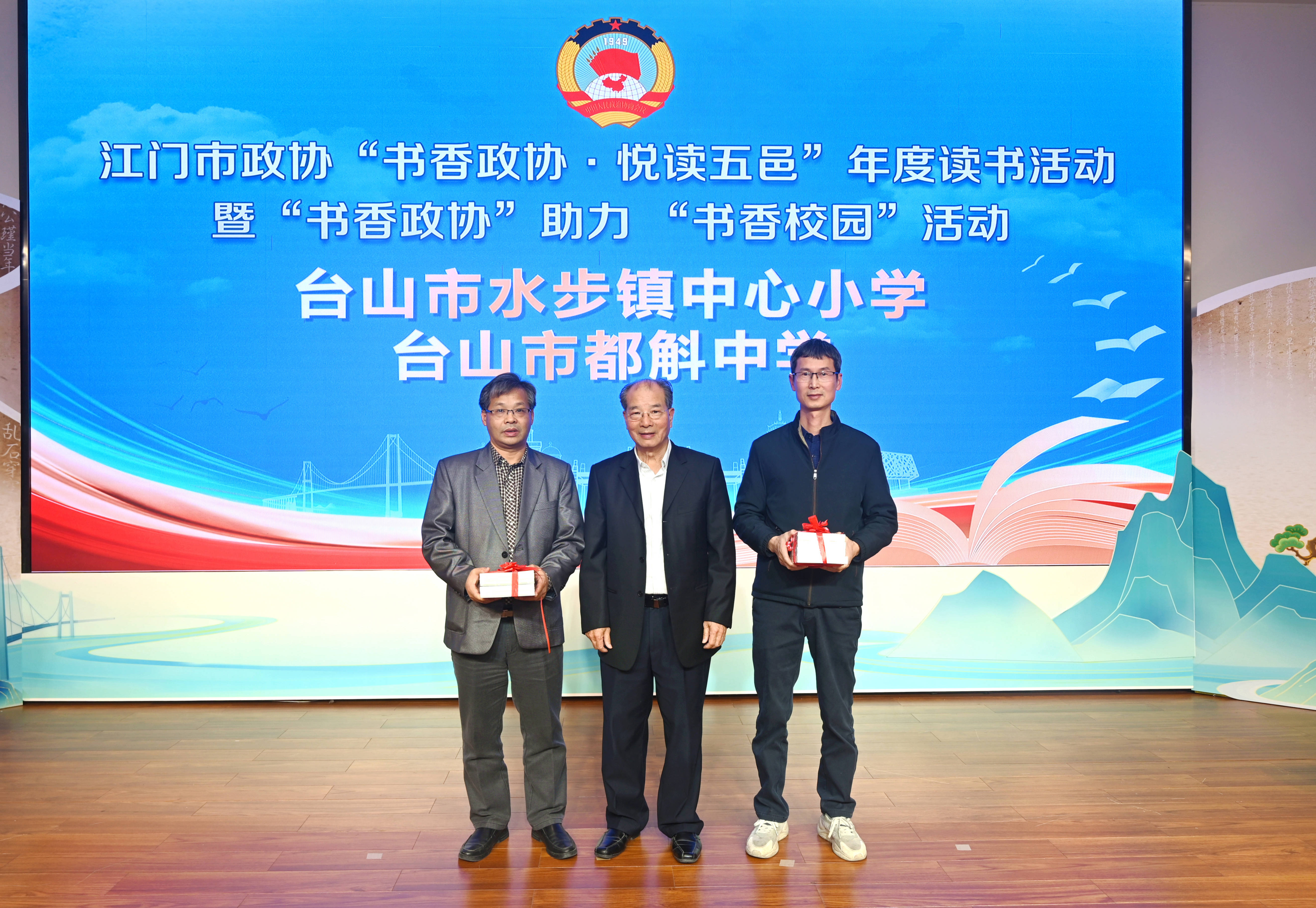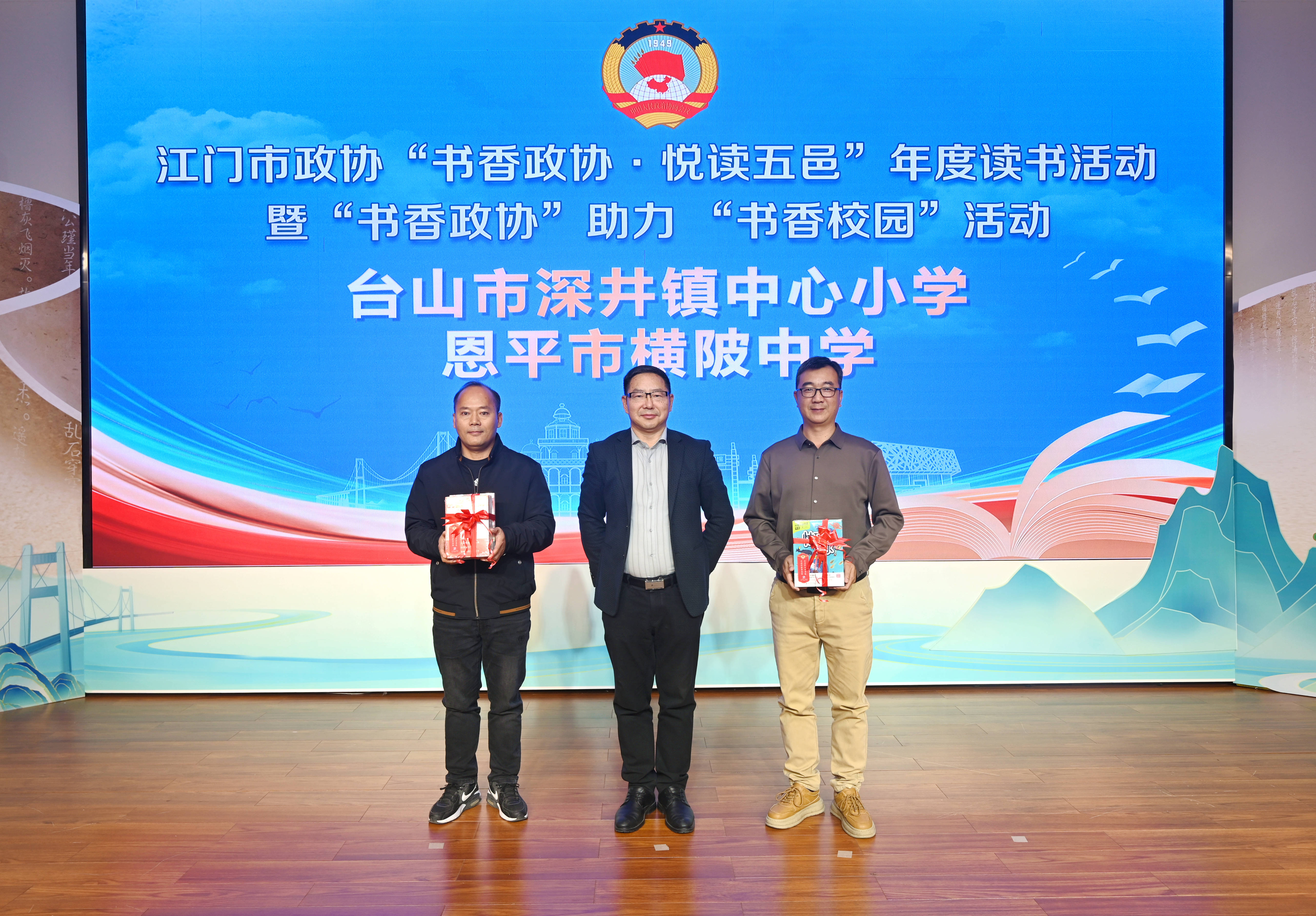 此外,活动现场还举行了“书香政协”助力“书香校园”活动,捐资委员代表劳锦财、赵崇悦、许有为分别向来自台山、恩平的6所学校捐赠图书,张磊向捐资委员代表颁发感谢状。