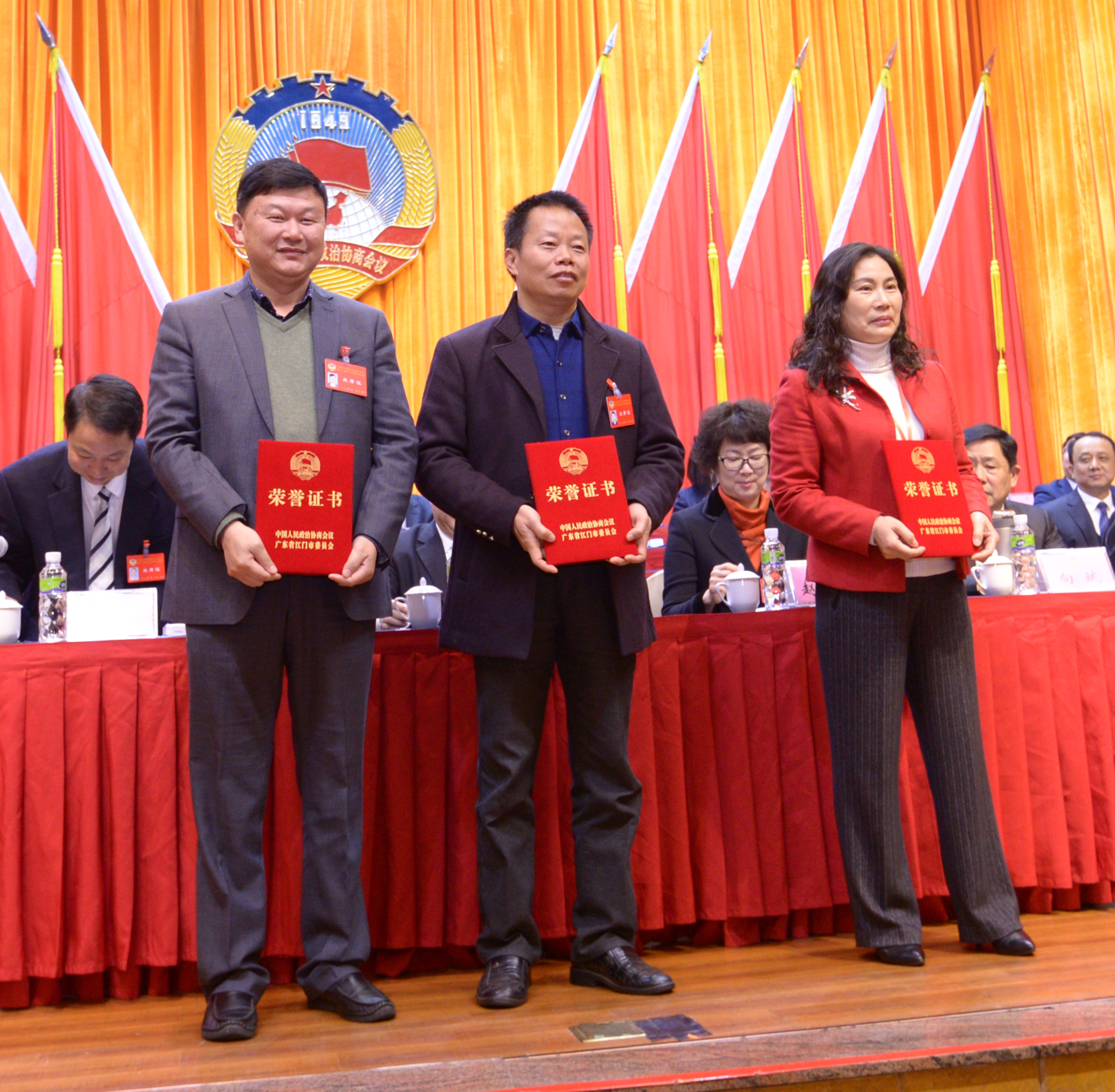 市政协十三届二次会议上,刘大磊(左一)作为《关于扶持我市摩托车产业组建公共研发平台的调研报告》代表上台领取优秀调研报告荣誉证书