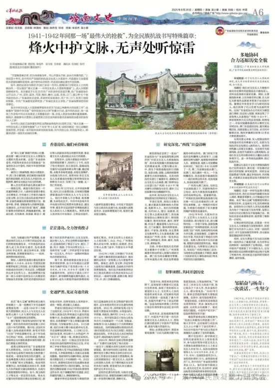 编者按:在中国人民抗日战争暨世界反法西斯战争胜利80周年之际,广东省政协办公厅主办了“烽火文澜——中国文化名人大营救专题展”,2025年8月28日《羊城晚报》A6版“岭南文史”专版报道,广东中华民族凝聚力研究会秘书长冯颖红教授接受采访。全文转载如下: