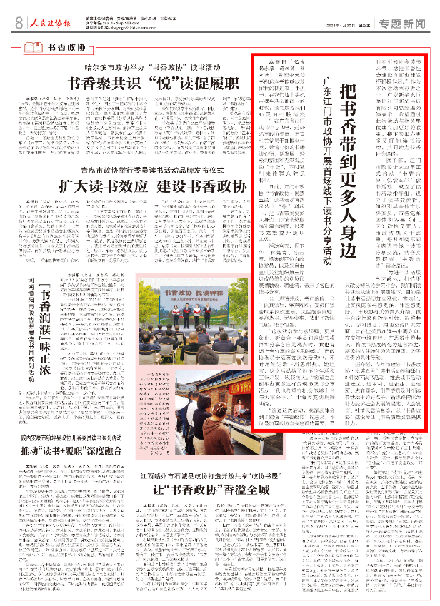 4月26日,《人民政协报》第08版刊发了《广东江门市政协开展首场线下读书分享活动 把书香带到更多人身边》的专题报道,现予转发。